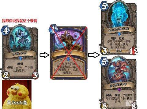 进化萨玩家就表示很难受:异变(进化)和退化将一起退环境。新系列明明出了5费5/8突袭还有5费3/12嘲讽这种虽然有负面战吼,但是身材超模到爆炸的单卡。结果,受到了史诗级加强,进化萨却要凉了。