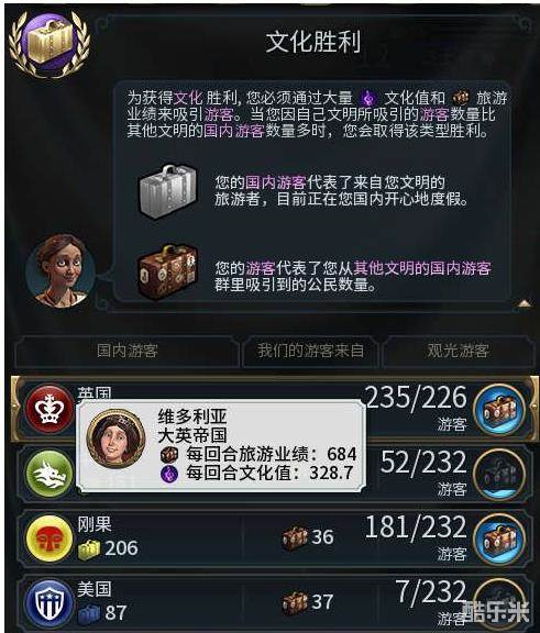 这里我被其他人误导过,澄清一下,网上有人说文化值,影响的是自己国内旅游人数,也就是自己的旅游防守,我试过文化值很高,国内游客依然少。其实不管国内,还是国外,真正关联的,还是旅游点数!文化直接影响的是政策快慢,如果说文化能 影响游客的地方,可能是间接的,文化推动政策,而政策推动旅游点数,旅游点数推动游客。