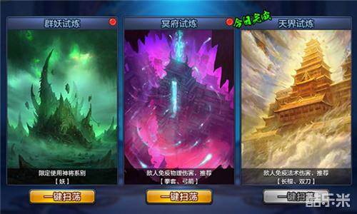 在群妖试炼中,你需要面对来自妖族手足们的佼佼者,在这里不容许任何异族的存在!所以能够助你一臂之力的就只有妖族神将。而在冥府试炼中,鬼族的精怪只有灵魂而无肉体之躯,因此物理攻击对他们无法奏效。此时便只能以拳套和弓箭这种法术系武器迎战方可一较高下!而在天界试炼中,那些面目虚伪的神将免疫法术伤害,面对无休无止的攻击,你唯一能做的便是用物理攻击撕下他们的假面,打个痛快!