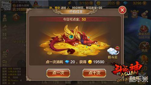 点石成金是最直接获取金币的方法,也是在金币极度稀缺的情况下的最后选择,点10次20金币,附赠11次翻筋斗。超过9万里都能获得5万金币,当然还有几率中500万大奖,平均10次点金收益25万金币。