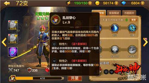 乱剑穿心是天蓬的必杀技,效果和其他必杀技一样造成伤害、击飞、无敌。特性上乱箭穿心比较像神将+牛魔必杀技的综合体,蓝色1星触发吸收伤害护盾,紫色1星触发持续回血。