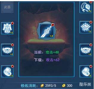 在对装备进行修炼强化时,八件装备是轮流进行的,强化后可以增加对应位置的属性,需要消耗一定数量的灵石。
