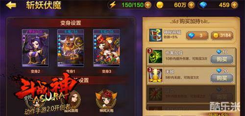 56~60层难度可是非常高的,敌人的血量提高了很多,战斗力较低和输出手法有问题的玩家,很容易就会出现无法在限定时间内将敌人消灭的情况。在变身的选择上推荐的是单体输出较高的罗刹,清理小怪速度快的牛魔和打BOSS速度快、连招强的玉狐。加持方面推荐购买无敌、伤害加成和复活。