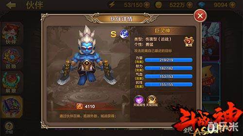 巨灵神是以游戏中巨灵神的形象制作的伙伴,相比原来模样,伙伴的形象要卡哇伊很多,也是S级伙伴之一,之前说的小琵琶和敖小宝,分别担当了输出和辅助的位置,而巨灵神却则是另一位输出伙伴。我们先来看看巨灵神的属性,初始力量最高为219,耐力最高为182,气血最高为153,抗性最高位155。