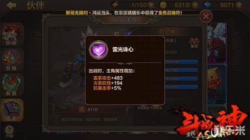 巨灵神的属雷,出站时初始属性增加雷系攻击484,火系抗性增加194,抗暴击率5%。天赋技能初始为对前方造成1392%的伤害,从这看出巨灵神的技能没有敖小宝的强,但是作为近程攻击,可以打击到目标的准确度越高,并且技能的释放次数要比敖小宝频繁,所以在战场是还是很有优势的。