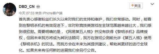 今天早上,《黎明杀机》官方微博发布了一条消息,表示《第五人格》并未受到《黎明杀机》的品牌授权。但允许《第五人格》使用《黎明杀机》玩法。