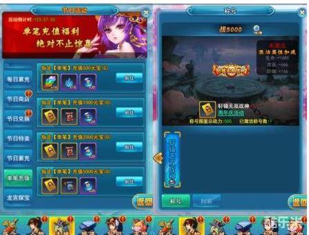 2. 活动规则:活动期间,满足指定【单笔】充值500元宝,即可获得超值礼包一份;满足指定【单笔】充值1000元宝,即可获称号【轩辕无双战神】;满足指定【单笔】充值2000元宝,即可获得翅膀皮肤【童趣龙猫】;满足指定【单笔】充值5000元宝,即可获得坐骑皮肤【辟邪瑞羊】可用来激活套装[云鬓花颜],战力飙升哦!