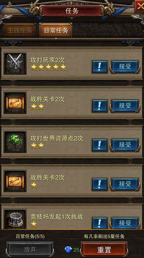 日常任务共有1星-5星五个等级,星级越高任务奖励也就越高。主要奖励为经验、声望、技能书。任务大都十分简单,每天可以免费完成五次,超出五次后需花费钻石重置任务并增加五次任务机会。另外做任务前不要忘记先领取任务。