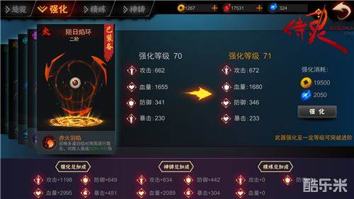 初次打造的武器并非其最强形态,唯有不断培养,才能成为神兵。玩家可以点开“武器”界面,通过强化与精炼这两种常规的强化手段来强化武器。强化与精炼只需要金币与器魂即可,强化增加攻击、血量、暴击、防御四个属性数值,强化到一定等级后,再进行强化操作有一定几率失败(失败时不掉级);精炼可增加攻击、血量、防御三个属性数值,且武器强化等级影响精炼属性上限,普通精炼有几率导致属性减少,钻石精炼必会增加精炼属性。