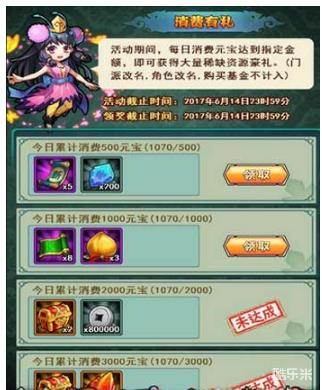 玩家每天累计消费500元宝,可以获得刷新符*5的奖励。对于高级玩家来说,每天消耗500元宝甚至几千元宝都不是事,所以这个奖励还是非常好拿的,毕竟是额外赠送的。不过,不推荐玩家使用十连抽的方式消耗元宝。