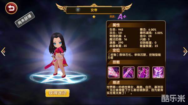 技能4:lv1女帝风范(被动)降低敌方全体闪避200点。