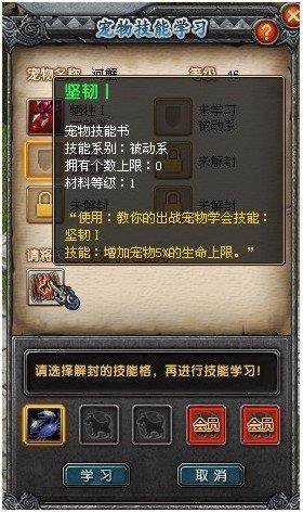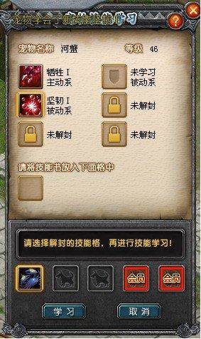 技能学习成功率100%;如果学习高级技能,且宠物拥有相应的低级技能,则新学习的高级技能会替换掉已学习的低级技能;如果学习其它技能,且选择的技能格中存在已学习的技能,则新学习的技能会替换掉已学习的技能。主动系技能学习后,会自动出现在主界面的宠物操作栏中。