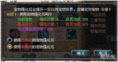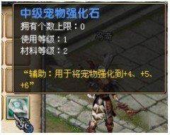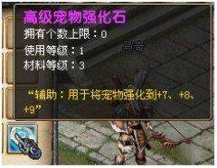 宠物强化时,需要消耗与强化级数匹配的强化石,有一定几率强化成功,成功后宠物4项资质都会提升一定的百分比,且强化次数+1,强化上限为9次。