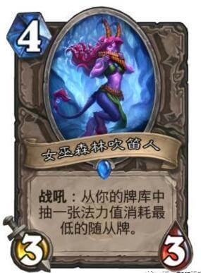 首先是这张吹笛人,这张卡在天梯构筑中可能会有奇效,毕竟属于一张指定型的过牌,4费33还过一张牌,可以预见会有一些卡组很需要这张卡。