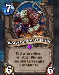 这张卡牌的效果是在回合结束后,对所有的受伤随从造成2点伤害。对于已经没有了鱼死网破的战士来说,的确非常需要解,但是这张卡只能说有点蠢,全场打2还必须是受伤的,我带个嘉顿好不好?还没你这个限制要求,真的是还没说自己,撞个4攻的随从就把自己秒了。