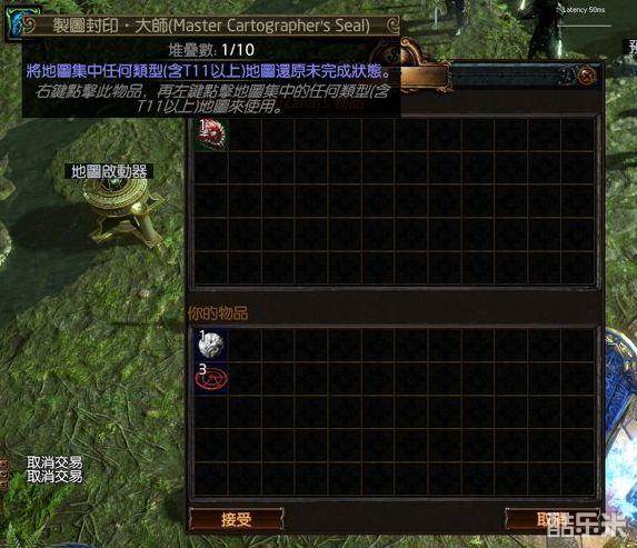 对应颜色的制图仪3个配合一个重铸石,比如我打了T11的挖掘场,拿到了T6的塑界玉,因为挖掘场并不在我们的控图名单上,因此想要塑封它,需要使用三个红色的大师制图仪(因为T11是红色地图)配合一个重铸石