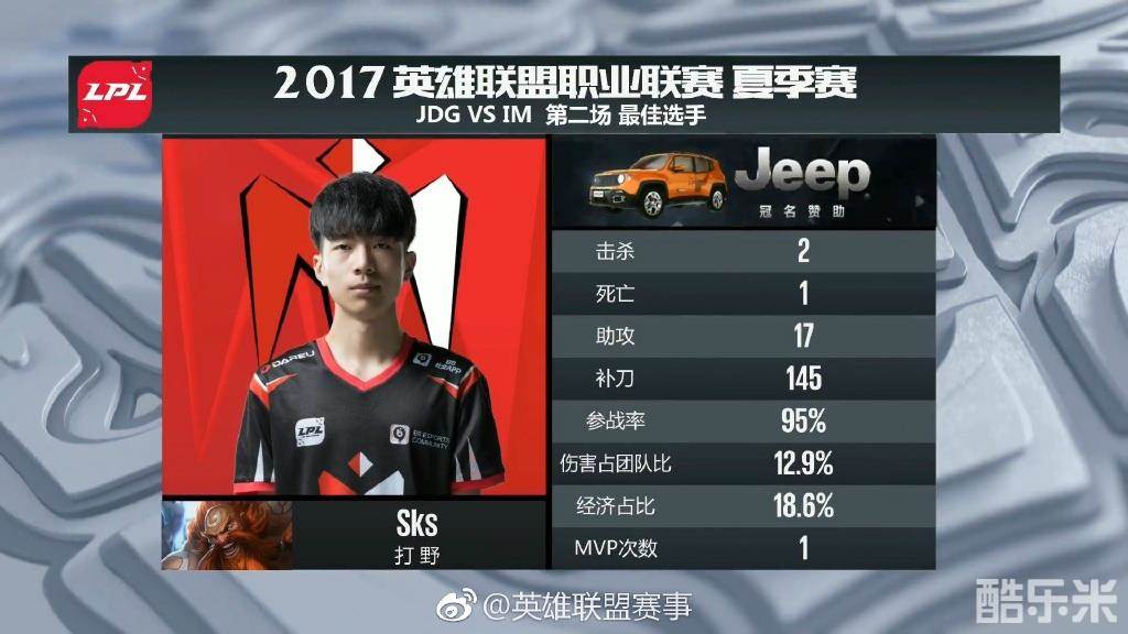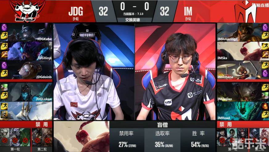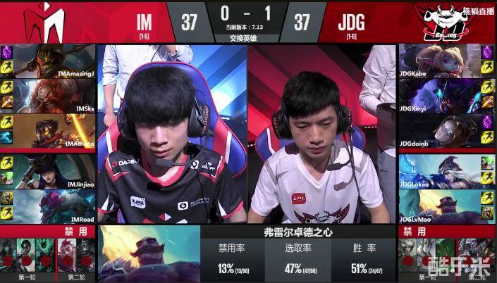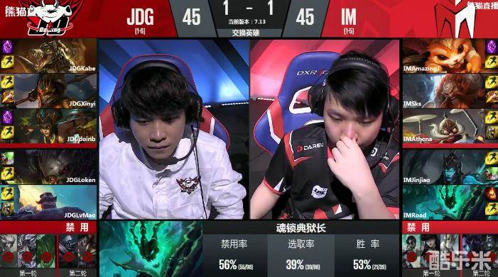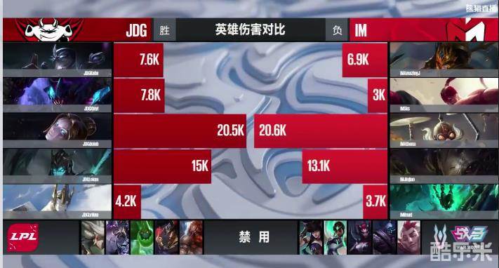 JDG使用的是加里奥辅助的阵容,双方打野镜像F6开。在比赛的前期,IM下路对线收获一血,之后快速的转线推塔,在前期拿到了不错的优势,兵线一直有着主动权。比赛进入中期,IM在上路打出一波比较着急的团战,被JDG抓住机会,稳住了比赛局面,让IM前期的优势荡然无存。JDG阵容开始发力,并在28分钟的火龙团战中,JDG开出优秀的团战打出1换4,随后JDG成功拿下大龙,一举建立胜势。携带着大龙buff,JDG从上路的推进彻底撕破了IM的防守,一波完美的0换5团灭,JDG成功拿下了首局比赛的胜利