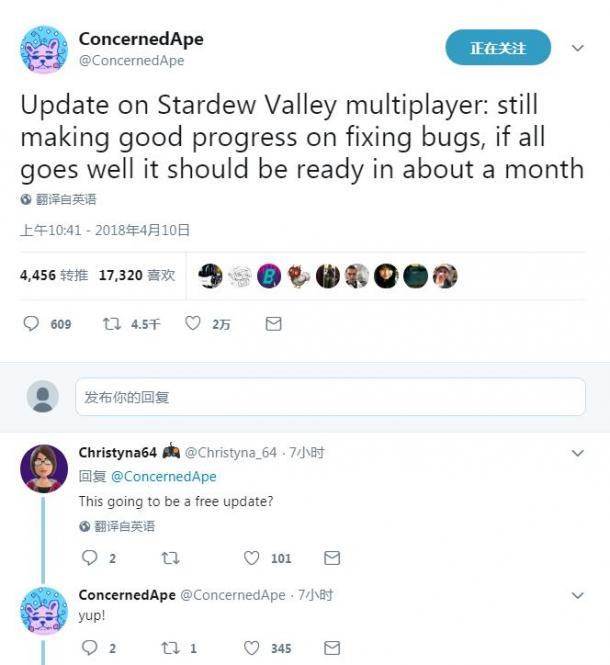 ConcernedApe强调本次包括多人模式在内的更新是免费的,所有购买了《星露谷物语》的玩家都可以获得。多人模式将先行登陆PC平台,之后登陆其他平台。