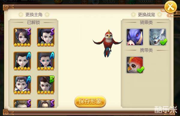 最后,点击选择右侧,你想携带或骑乘的宠物,点击保存形象,如果你选择了骑乘类宠物,即成功的让你的英雄角色骑上了坐骑。