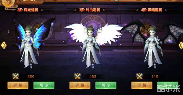 翅膀光翼以“阶”为单位划分,不同“阶”位的翅膀光翼外形不同,或灵动轻盈如翩翩蝶翼,或霸气生雷似魔龙振翅。