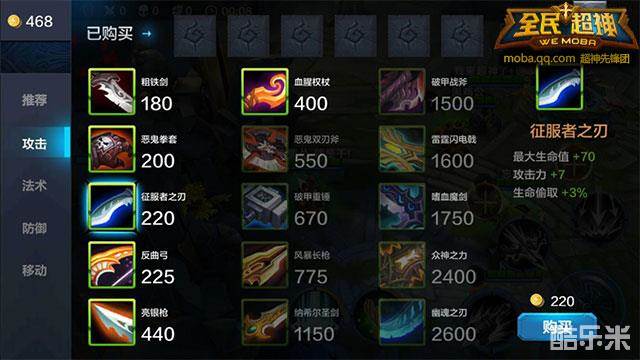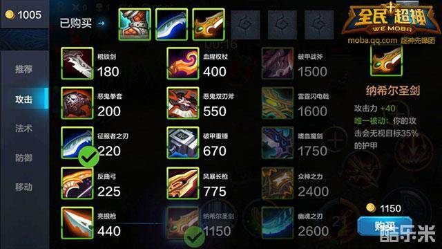 在竞技对战中,玩家通过右上角的如同购物篮一样的图标,可以查看所有装备,【攻击】列表中的装备就全部可以直接或间接增加物理攻击能力。第一列装备可以理解为是初始类装备,其中最便宜的是粗铁剑,只需要180,只加10攻击力,最贵的是亮银枪,售价440,攻击力+25。