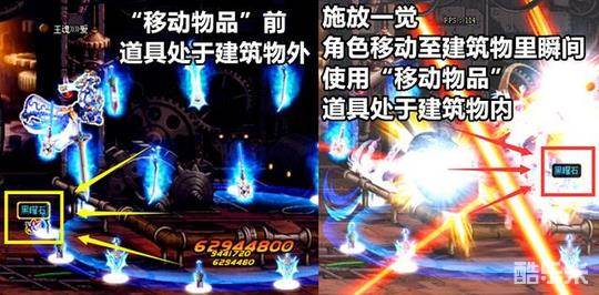 举个例子,就比如剑魂施放一觉过程中,刚好角色位移至建筑物里面,然后在那一瞬间使用“移动物品”吸取道具功能,那么道具就会被吸取至建筑物里面。