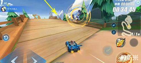 不过这个近道出口正对着弯道中心,想直接漂移过弯是比较困难的,所以在冲出近道的时候可以借助碰撞的力道顺势漂移,将车身调正。