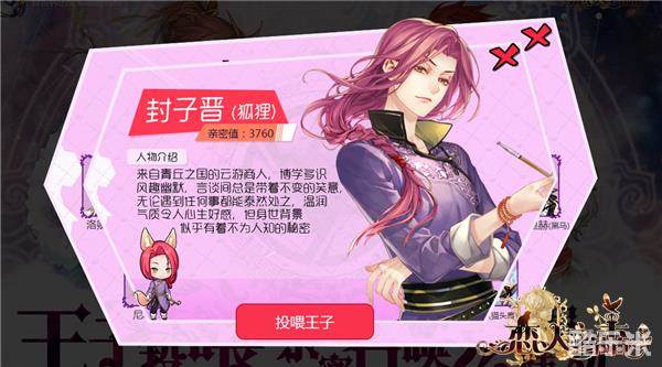眉目细长的红发青年将松散的长发随意绑了搭在肩头,看上去闲散而随意。狐狸公子封子晋此次获得了3760亲密值,在一众或俊美或可爱的青年少年中,封子晋自带的慵懒气质显得别样出众,嘴角微微含笑的样子更是给人一种亦正亦邪的错觉~相信很多喜欢子晋的小伙伴也都是这么想的吧~