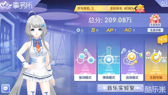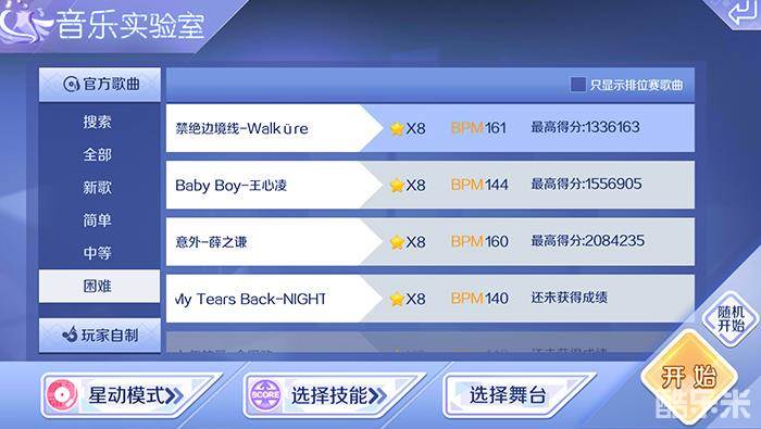 事务所星动模式通关之后,就去挑战7星难度的歌曲,在音乐实验室中可以查看所有,可以优先挑战你喜欢的7星难度歌曲,这类歌曲通常你对旋律比较熟悉,这样挑战起来会事半功倍!另外7星和8星歌曲的难度提升不大,所以7星难度全部完成后,就可以去直接挑战9星难度歌曲!最后10星歌曲难度提升较高,需要熟悉歌曲的音符,并经过大量的练习之后才可以掌握。