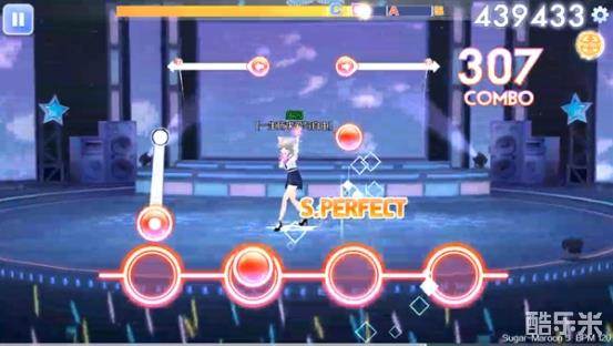 最后Sugar歌曲的结尾部分,有一个非常长的长按滑动音符,并且会一直跨越4个音符键。这个音符是最容易出现错误的地方,并且MISS后会直接损失大量的得分,应对这个音符的时候,注意是从左手开始,使用大拇指按键的玩家,注意手掌的横按操作跨度。