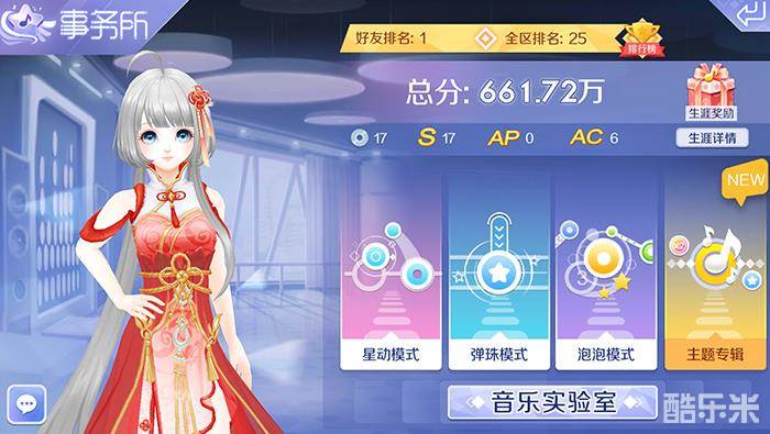 QQ炫舞手游事务所包括了星动模式、弹珠模式、泡泡模式三种,玩家可以通过章节形式挑战歌曲。随着玩家的等级提升,玩家解锁主题专辑功能后,可以在其中挑战QQ炫舞经典的四键模式,另外还可以参与主题音乐挑战。音乐实验室中包含了QQ炫舞手游全部歌曲,玩家可以自由选择并挑战,最后玩家通过事务所挑战可以获得服饰奖励、另外还可以获得生涯奖励。