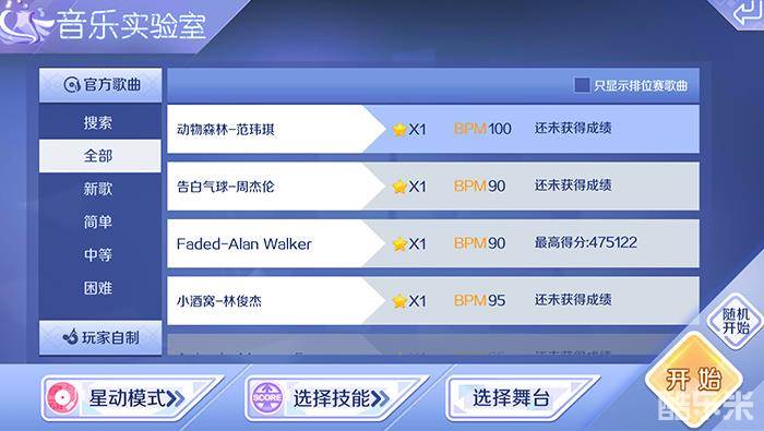 当玩家等级达到11级后,就可以解锁音乐实验室,其中可以查看QQ炫舞手游曲库中的全部歌曲。音乐实验室会按简单、中等、困难将歌曲进行分级,这样可以帮助玩家阶段性的提升自己的技术。音乐实验室挑战歌曲,还支持玩家选择不同模式、技能、舞台,并且还有玩家自制歌曲功能,不过在测试版本中还没使用过。
