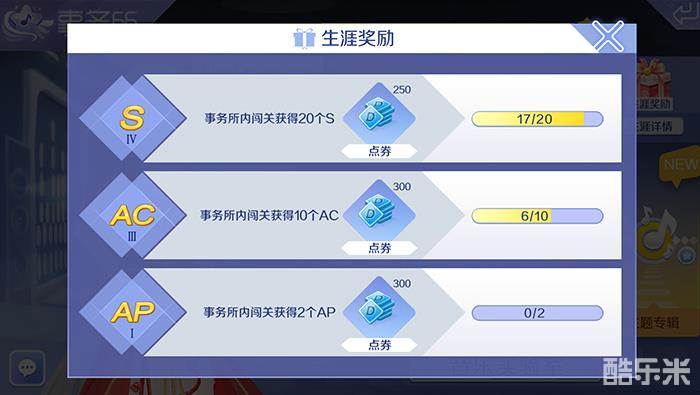 最后玩家通过事务所挑战,不仅可以获得服饰奖励,另外还可以完成生涯奖励。玩家达成S评价、AC评价、AP评价后,就可以积累生涯奖励任务,当达到任务要求后就可以获得大量的点券奖励。