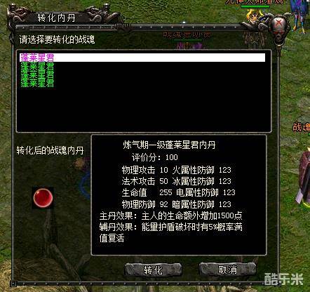 为内丹提升等级时,需要1颗低一阶段或更高阶段的同种类战魂内丹来做引子,并需要消耗一定数量的材料。