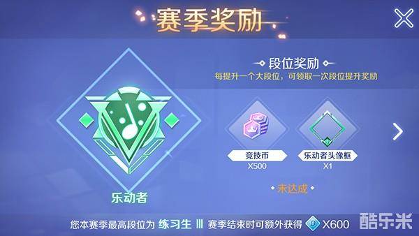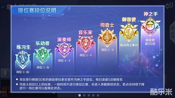 排位赛每局参与的非挂机玩家,还可以获得舞者积分,当舞者积分积累满时可以获得金币、点券、竞技币的奖励。参与排位赛获得的段位是玩家技术的象征,随着段位的不断提升随机歌曲的难度也会逐渐提升。
