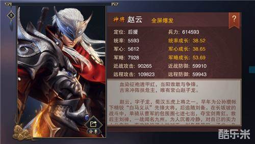 赵云所属兵种为弓骑兵,注定就是一位侧重于伤害的武将,在属性成长方面,统率成长称得上优秀,在军心与君略的成长上就非常恐怖了,是整个游戏最优秀的一档。