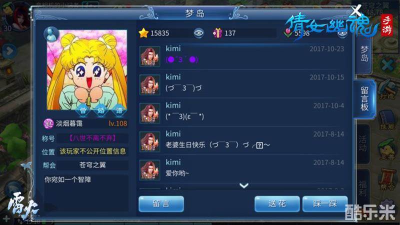 和倩女手游中其他的侠侣一样,kimi和淡烟暮霭之间也有着许多有趣的瞬间。为了侠侣淡烟暮霭主动放弃生活玩家的玩法,变成双切天赋的高战魅者。为了教淡烟暮霭玩好魅者,kimi在CC直播潜伏几个小时。而且据淡烟暮霭爆料kimi不仅声音好听,而且还约法三章:淡烟暮霭永远都是对的。可以说是男友力十足了!
