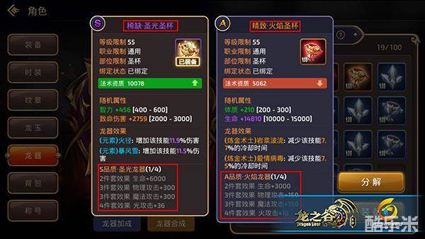 在以往小伙伴们背包里有多余的用不上的装备是不是都分解了呢?龙器就可以不用分解,在有更好属性的龙器后替换下来的龙器可以保留着,在龙器界面底部会有一个“龙器合成”的按钮,点进去后就能把两个同等级且同品质的龙器进行合成,合成是免费的不用耗费金币什么的,合成后的龙器保底不低于原合成龙器的品质,简单的说就是用两个A级的龙器是怎么都不可能合出B级的龙器来的,合成后的龙器部位是随机的,属性及技能属性都是随机的,人品好的话还有概率升级成更高品质的龙器。