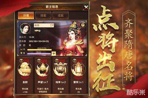 超过50个隋唐时代帝皇名将可供招募,英勇无敌的猛将、足智多谋的军师、运筹帷幄的统帅、巾帼须眉的女将、更有一代女皇任君选择,伴君征战天下;如李世明、武则天等唐朝著名帝皇;如李白、秦琼、罗成、李靖等传奇名人!