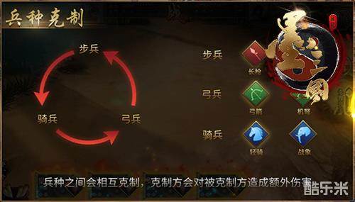 除了战斗力以外,还有一个影响阵型的因素就是兵种,不同的兵种之间有相互克制的作用,克制方会对被克制方造成额外伤害。步兵克弓兵,弓兵克骑兵,骑兵克步兵。步兵又分为长枪、盾卫,弓兵分为弓箭、机弩,骑兵分为轻骑、战象。排兵布阵时,可以让克制敌方的兵种去攻击对方,更有可能获得胜利。
