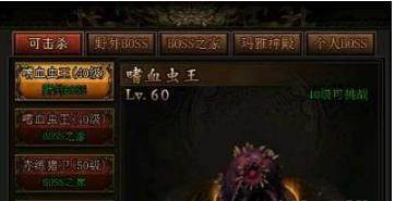 游戏中的BOSS氛围野外BOSS、BOSS之家、玛雅神殿、个人BOSS几种,激战BOSS界面中的第一个会给大家列举出当前可以挑战的BOSS。