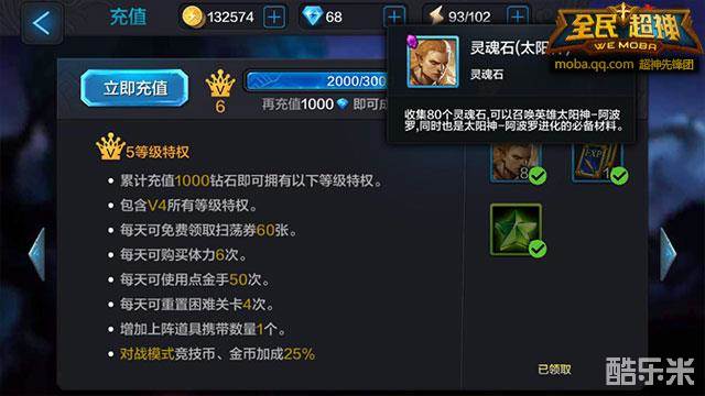 在《全民超神》现阶段游戏版本中,不支持从副本中获取太阳神-阿波罗灵魂石,因此无法通过副本挑战收集灵魂石合成而得。那究竟如何获取呢?其实也非常简单,只需要在游戏中充值成为V5贵族,就能免费购买V5特权礼包,获得80个太阳神灵魂石,初始三星级的太阳神也正好需要80个灵魂石合成,所以V5贵族就能直接合成召唤获得了。