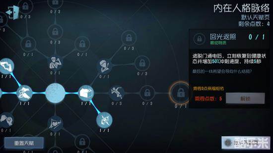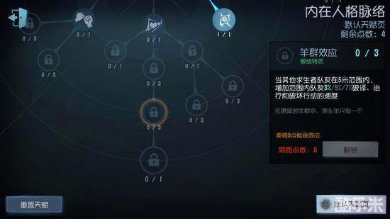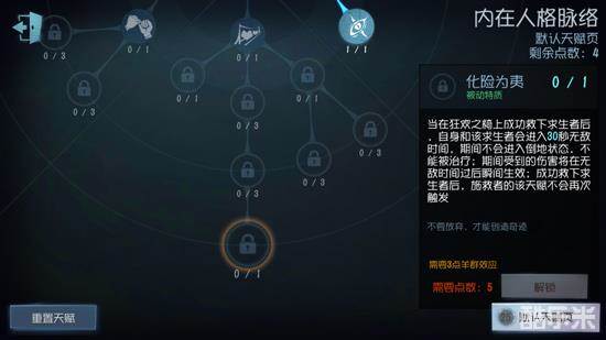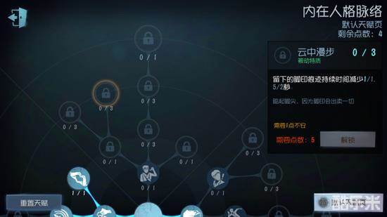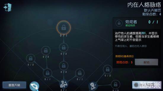 冷静(上边方向): 主要的隐藏系加点方向,核心天赋是【云中漫步】,【低调】,【旁观者】。这边的天赋加点很适合冒险家角色,或者一些喜欢躲猫猫的佛系玩家,为的就是能安静地偷电机,屠夫什么的最好不要来找我。