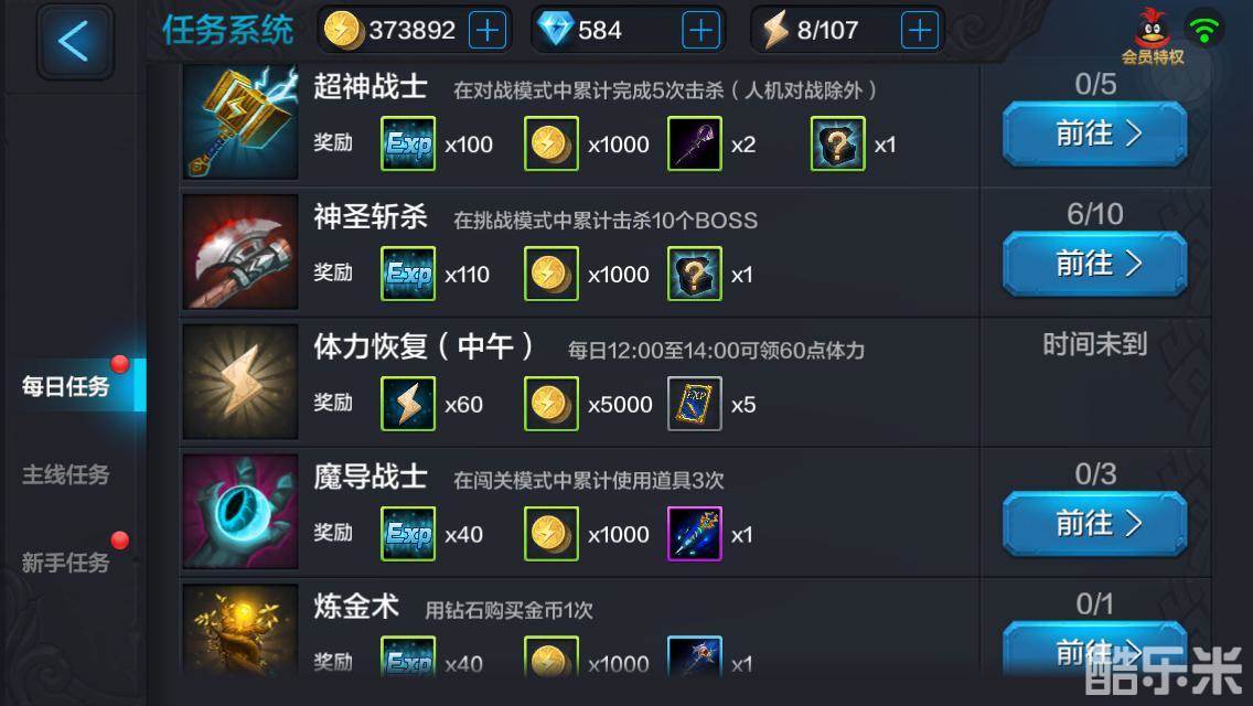 每日任务里面基本都是些简单的,可以看下图,里面包含赠送10个好友体力,闯关普通副本,困难副本,道具使用,挑战模式,对战模式,道具使用,商城购买5次等等很多都是很容易去做的,这是新手玩家获得主要经验的一个快捷途径!这里会给金币 装备 经验卡 升星石等等!只要骚年你去做,一切都不是难事!!