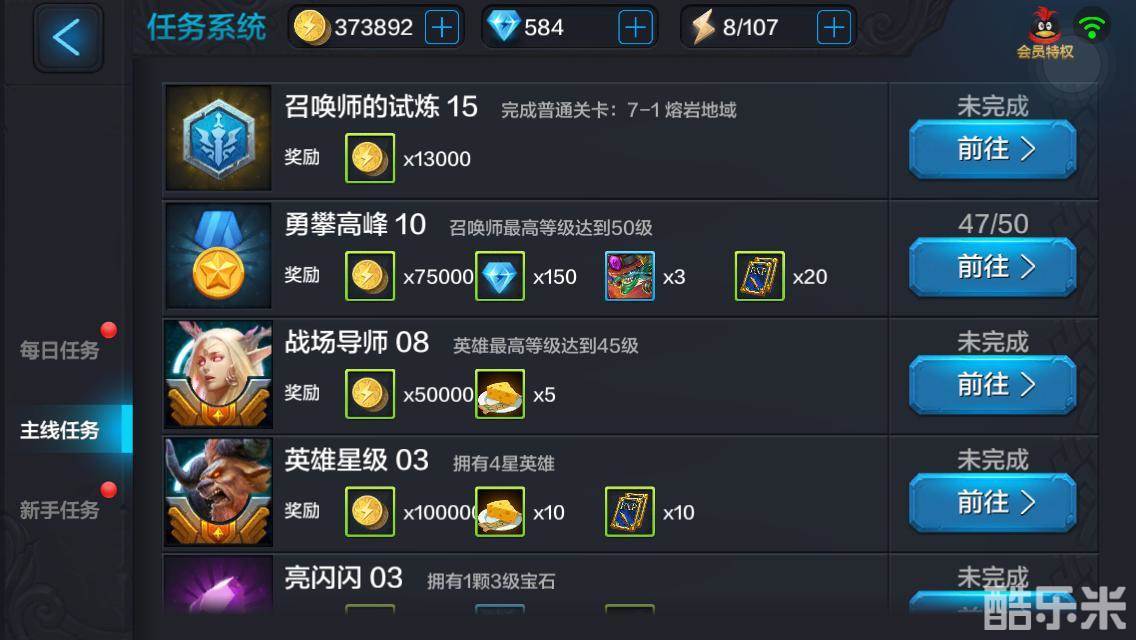 主线任务这个就要求比较苛刻,而且做起来有些难度,里面比如完成困难关卡第几几关,召唤师等级达到多少级,英雄等级达到多少级,拥有几星英雄 拥有几级宝石等这些任务,这些是按照你的等级一点点提高的,一层层的这样领取奖励上来!这里也是会给金币 经验 英雄灵魂石等等这些!按照系统任务去做就好啦!~