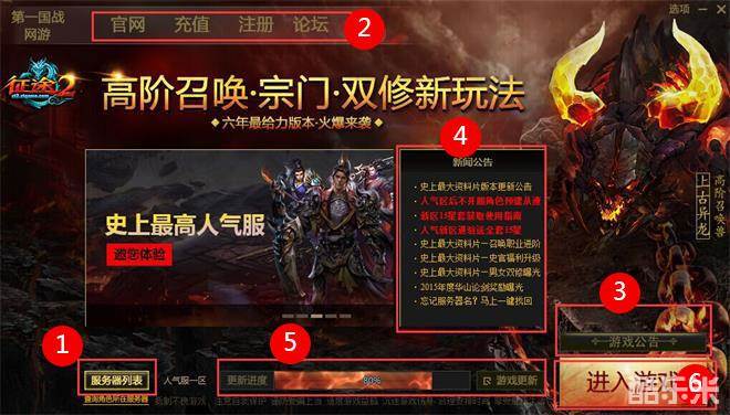 在“服务区选择更新界面”中选择你所想进入的游戏大区并点击区域6中的“开始游戏”按钮即可进入“登陆界面”。