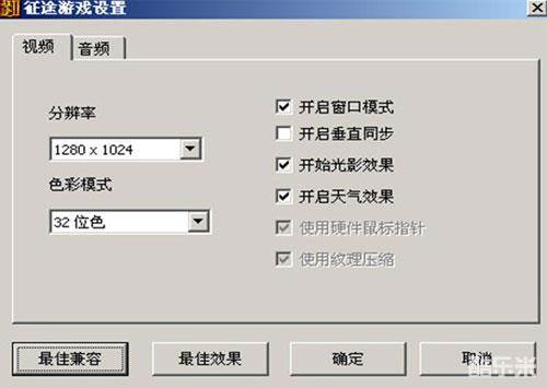 在“界面右上角”有一个“选项”的功能按钮。点击进入后就会看到如图所示的“征途游戏设置”界面,主要选项有“分辨率”、“色彩模式”、“是否窗口化”等。如果你的计算机配置属于中等水平,建议你选择“最佳兼容”;如果你的计算机配置属于比较高的水平,建议你选择最佳效果,以便获得最佳的游戏体验。