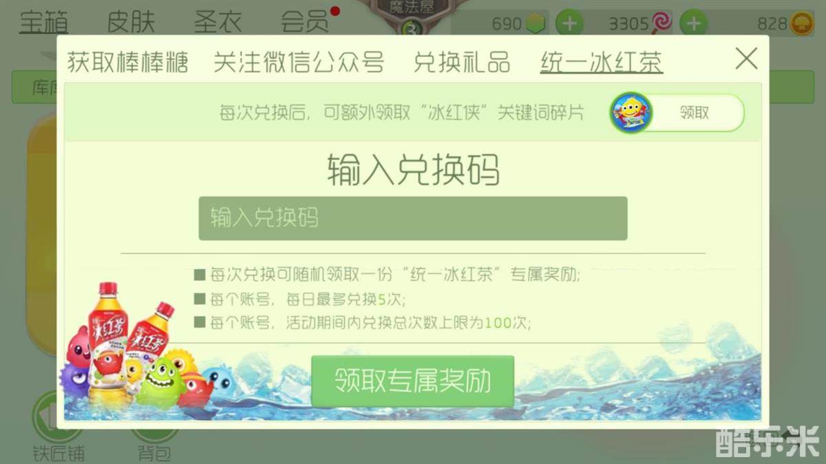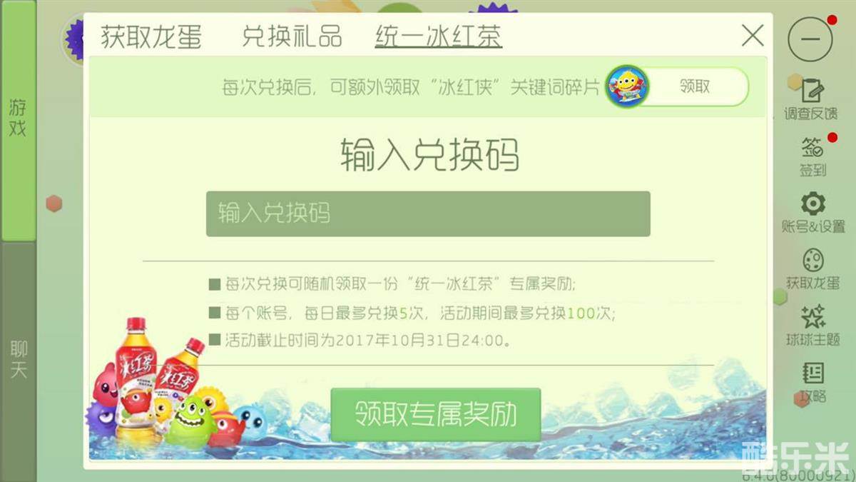 即日起至2017年9月30日,玩家购买《球球大作战》合作款冰红茶后只要拧开瓶盖,即可获得12位专属礼包兑换码。登陆游戏,点击首页右侧“获取棒棒糖”即可进入统一冰红茶专属的兑换礼品界面,也可以进入首页下方的 “魔法屋”,在获取龙蛋页面进入专属兑换窗口。开盖就能100%获得统一专属光环、孢子、金蘑菇以及彩豆等奖励,每次兑换后,还可额外领取“冰红侠”关键词碎片。
