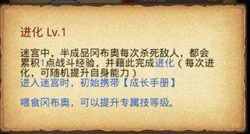 半成品技能:【技能】迷宫中,半成品冈布奥每次杀死敌人,都会累积1点战斗经验,并藉此完成进化(每次进化,可随机提升自身能力)进入迷宫时,初始携带【成长手册)