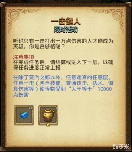 活动要求:在除了蒸汽之都之外的迷宫任意层,任意一击(包含技能、普通攻击、法术、道具伤害)等使怪物收到大于等于10000点伤害。该活动仅限渠道服。
